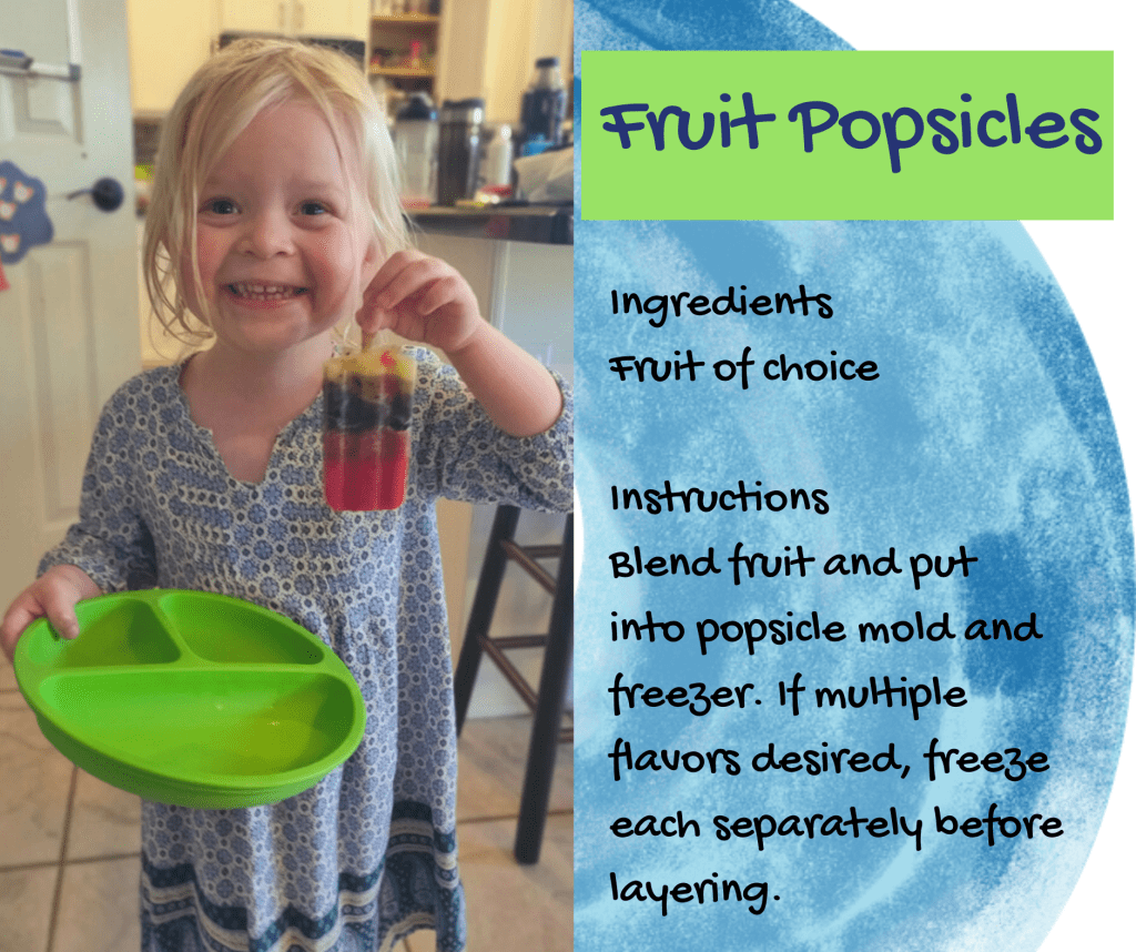 No popsicle mold or need something quicker? Another option closely related to this is simply freezing fresh fruit and eating it in lieu of dessert. Buy berries or other favorite fruits, wash, cut into desired and consumable size, wash, place on a cookie sheet covered in parchment paper, and freeze. Once frozen through, place in freezer safe container or Ziploc.