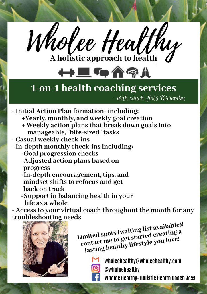 Wholee Healthy has officially opened it’s doors, and I have a wait list available for anyone that would like to work with me 1-on-1! The next opening is the end of July, but by signing up now, you will still get the launch discount when we start! Want to know more? This is a breakdown of what working with me looks like: