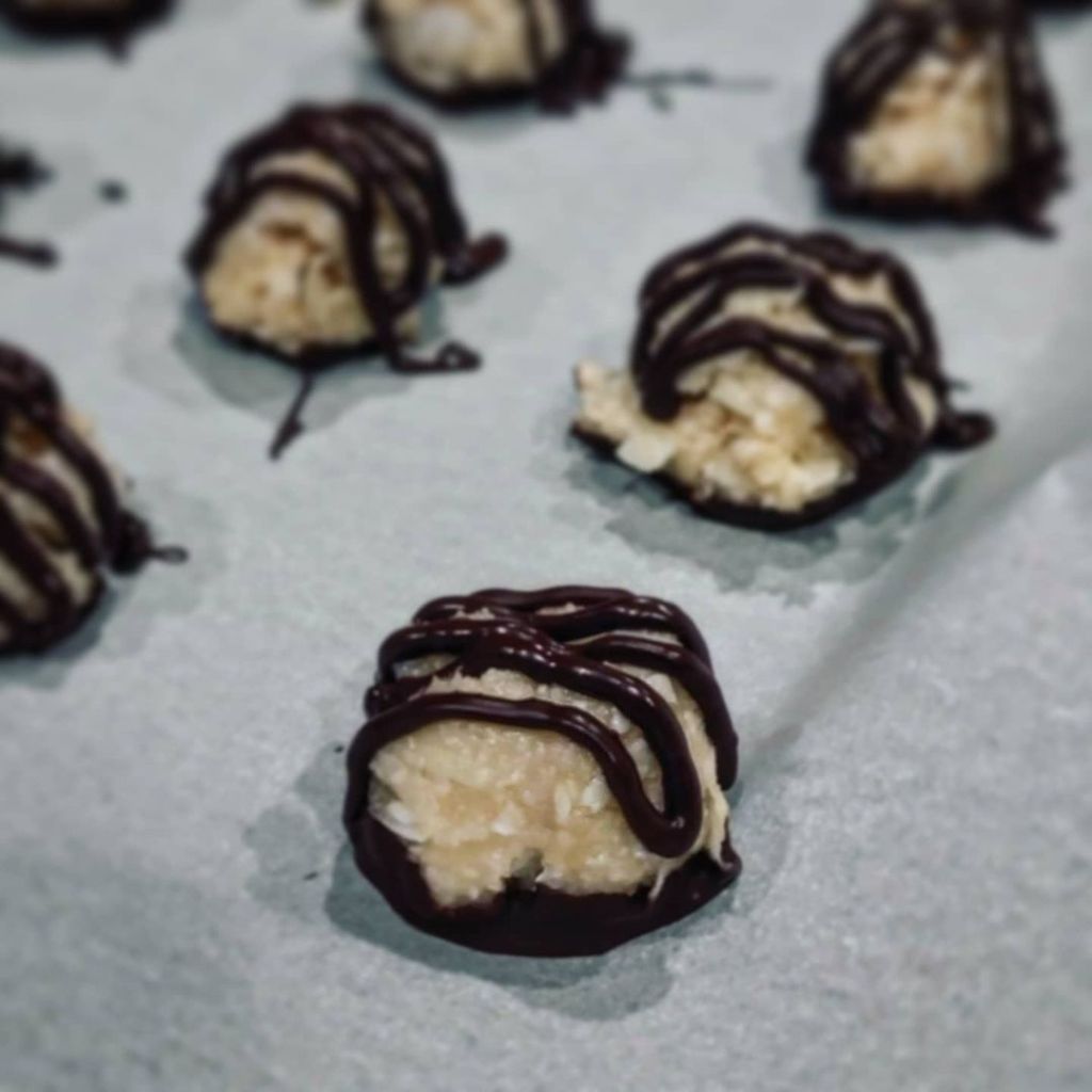 -Using a cookie scoop, scoop firmly packed balls of coconut mixture.