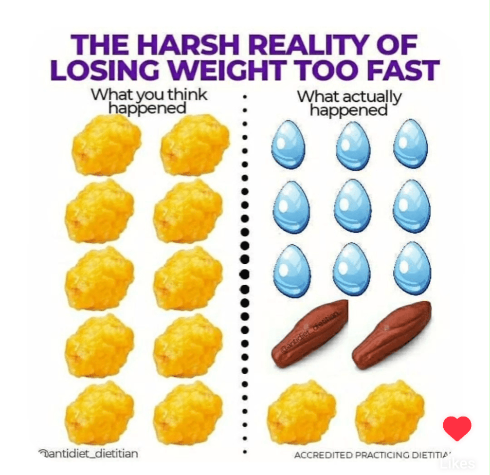 –Be mentally prepared for the fat loss to be SLOW- .5-2lbs/week unless you have a significant amount to lose (this number will usually be higher in the first week due to water weight & may be higher than this if you have a lot to lose)